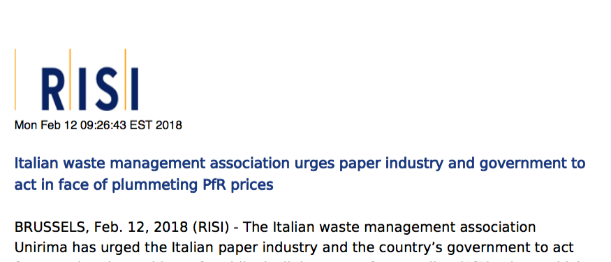 Effetto Cina sul Riciclo – Articolo Sole24Ore9 Febbraio 2018Giuliano Tarallo Presidente Unirima su RISI12 Febbraio 2018 11 Febbraio 2018 Categories News Tags Questo contenuto è riservato ai soli Soci di Unirima, accedi cliccando qui. Se non sei Associato e vuoi scoprire i vantaggi riservati ai Soci UNIRIMA clicca qui e scopri come aderireAlready a member? Accedi Related posts15 Aprile 2026Meeting del ramo carta di Recycling Europe: Berlino, 13 aprile 2026Read more14 Aprile 2026Autorità Garante della Concorrenza e del Mercato – Presentata la Relazione annuale sull’attività svoltaRead more14 Aprile 2026Determina ARERA approvazione schemi tipo proposta tariffaria 2026-2029Read more