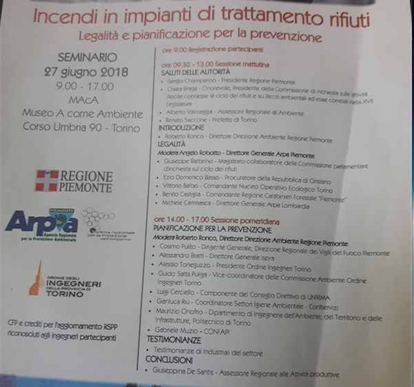 28 Giugno 2018UNIRIMA – in collaborazione con Confindustria Piemonte – ha partecipato al convegno “Incendi in impianti di trattamento rifiuti – Legalità e pianificazione per la prevenzione” organizzato a Torino da Regione Piemonte e Arpa Piemonte in collaborazione con l’Ordine degli ingegneri della Provincia di Torino.