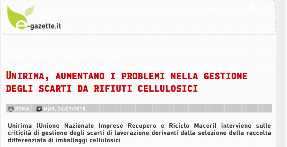Articolo di E-Gazette.it “Unirima, aumentano i problemi nella gestione degli scarti da rifiuti cellulosici”