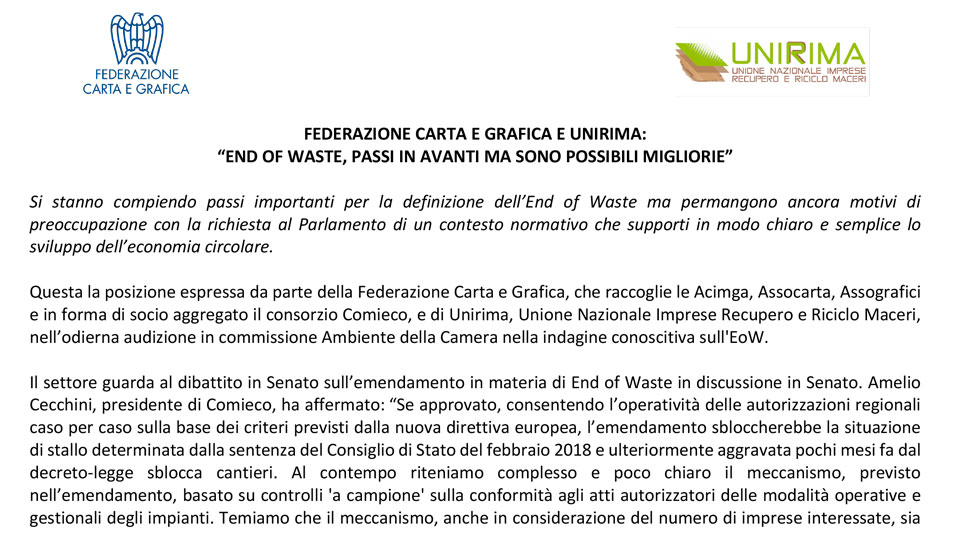 Emendamento DL “Salva Imprese” su End of Waste “caso per caso” – Il commento di UNIRIMA10 Ottobre 2019Audizione alla Commissione Ambiente della Camera dei Deputati di Comieco15 Ottobre 2019 11 Ottobre 2019 Categories Attività News Tags Questo contenuto è riservato ai soli Soci di Unirima, accedi cliccando qui. Se non sei Associato e vuoi scoprire i vantaggi riservati ai Soci UNIRIMA clicca qui e scopri come aderireAlready a member? Accedi Related posts15 Aprile 2026Meeting del ramo carta di Recycling Europe: Berlino, 13 aprile 2026Read more14 Aprile 2026Autorità Garante della Concorrenza e del Mercato – Presentata la Relazione annuale sull’attività svoltaRead more14 Aprile 2026Determina ARERA approvazione schemi tipo proposta tariffaria 2026-2029Read more