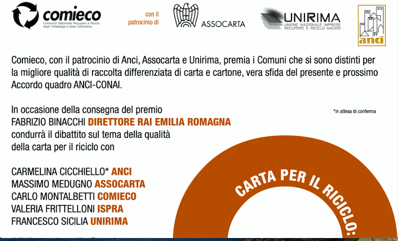 Si terrà il 7 novembre 2019 l’evento “Carta per il riciclo: Premio Qualità 2019” organizzato da Comieco ed al quale UNIRIMA ha concesso il patrocinio oltre ai patrocini dell’Anci e di Assocarta.
