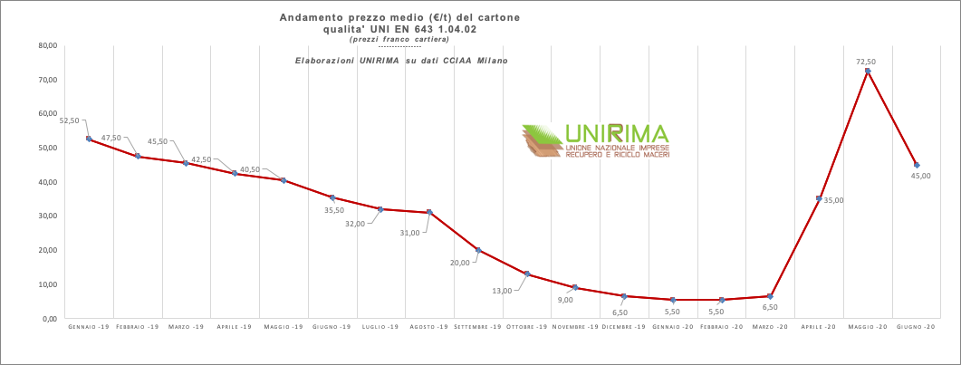 Il grafico sottostante riporta l‘andamento dei prezzi del cartone (valori medi fonte CCIAA) da gennaio 2019 a giugno 2020.
