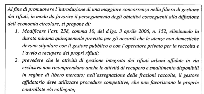 L’AGCM formula quindi una serie di proposte articolate in otto capitoli. Il capitolo V riguarda “La concorrenza a servizio della sostenibilità ambientale” . Il paragrafo B in particolare (qui l’estratto Segnalazione AGCM_PrgB_pag68) ha come titolo “Il ruolo della concorrenza nella promozione di un’economia circolare nel settore dei rifiuti“. L’AGCM, partendo dai dati che dimostrano come l’attività del riciclo promuova la “concorrenza dinamica” ed è in grado di aumentare il PIL di un’ulteriore 0,5% entro il 2030 creando circa 700.000 nuovi posti di lavoro, riporta una serie di elementi e considerazioni che ribadiscono come sia necessario assicurare dinamiche competitive e agire sulle criticità connesse alla mancata piena applicazione del principio di concorrenza espressamente previsto nel D.lgs 152/06. Il paragrafo B analizza i diversi aspetti inerenti il mancato rispetto dei principi di concorrenza e le criticità, già altre volte presentate, del settore dei rifiuti come l’affidamento ad un unico soggetto di tutte le attività di raccolta, trasporto e avvio a smaltimento e recupero dei rifiuti urbani nonché la formulazione del comma 10 dell’art. 238 inerente la questione dei “5 anni”.
