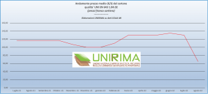 Sotto il grafico con l’andamento delle quotazioni del cartone (Qualità UNI EN 643:1.04.02) da luglio 2021 ad agosto 2022: