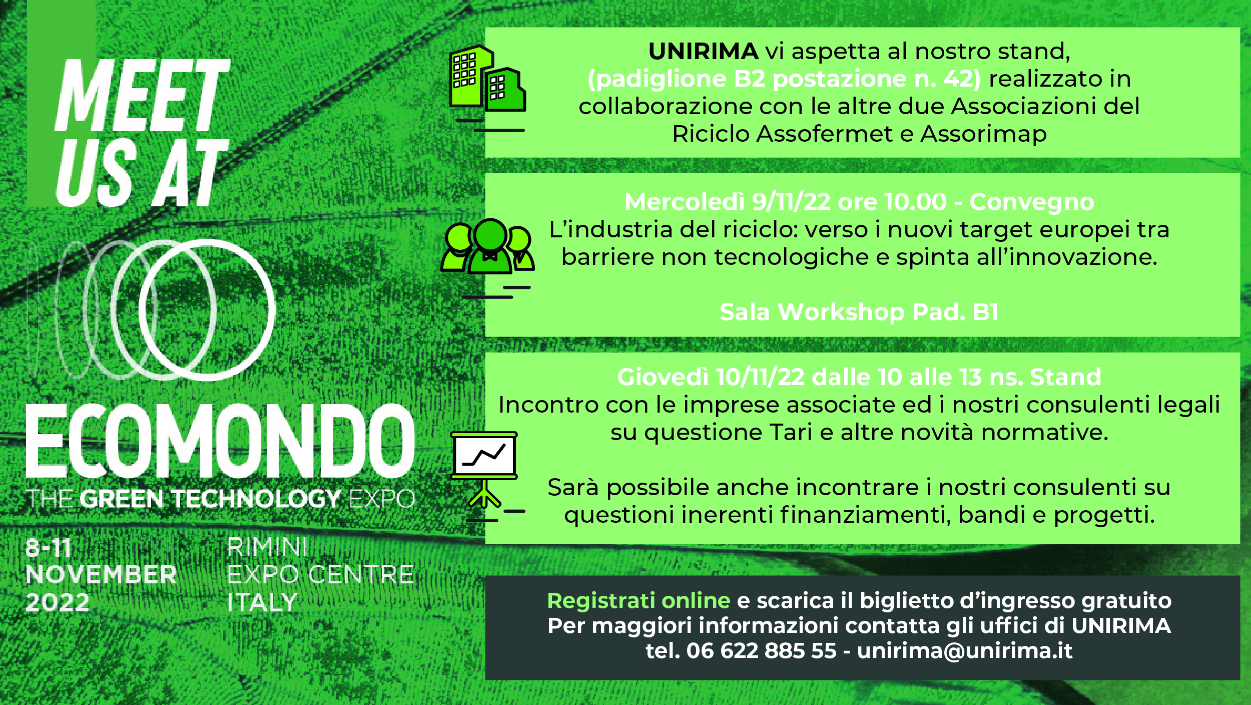 9 Novembre 2022Torna a Rimini dall’8 all’11 novembre p.v. Ecomondo, manifestazione di riferimento della green e circular economy che unisce tutti i settori e i principali stakeholders della transizione ecologica. UNIRIMA sarà presente con un proprio stand, in collaborazione con le altre due Associazioni delle imprese del riciclo Assorimap e Assofermet, situato nel Padiglione B2, postazione 42