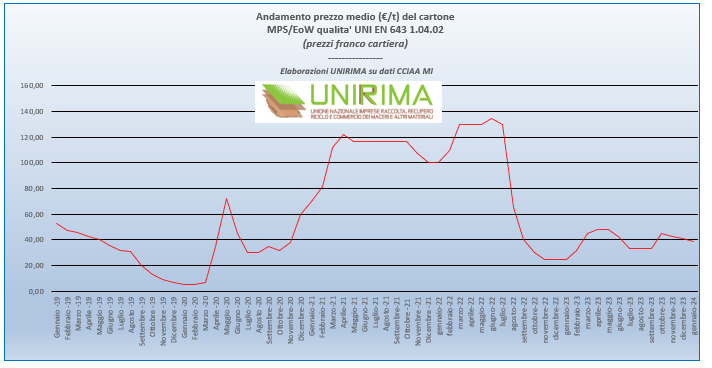 - cartone qualità “1.04.02” = – 2,00 €/t rispetto al prezzo del mese precedente (-4,9%)