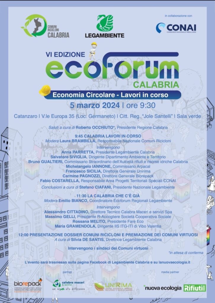 1 Marzo 2024Si terrà martedì 5 marzo 2024 alle ore 9:30 la sesta edizione dell’Ecoforum Legambiente Calabria “Economia circolare – Lavori in corso” e la presentazione del dossier “Comuni Ricicloni 2024” presso la sala verde della cittadella regionale Jole Santelli, in Località Germaneto (Catanzaro).