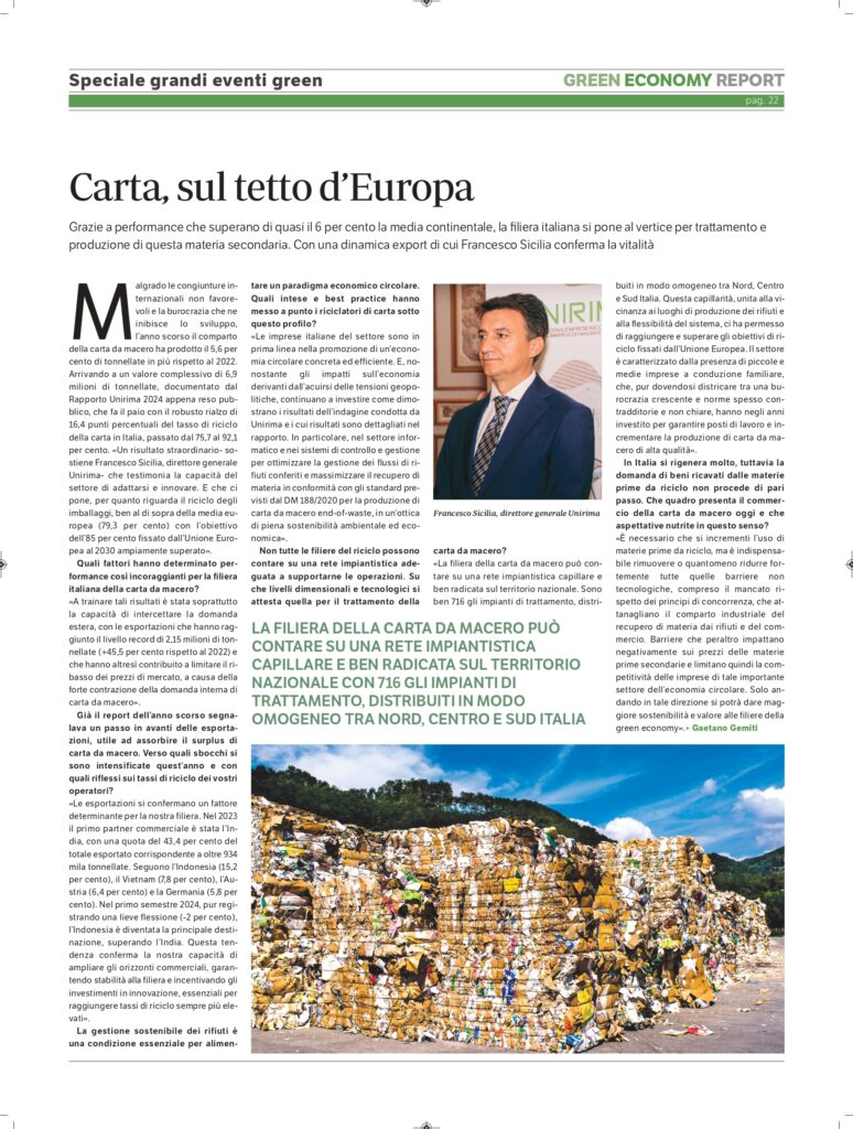 25 Novembre 2024In una recente intervista al Report Green Economy (tabloid del gruppo Golfarelli Editore) il Direttore Generale di Unirima, Ing. Francesco Sicilia, ha presentato i dati del Rapporto 2024 e alcuni dei risultati straordinari raggiunti lo scorso anno dal comparto italiano della carta da macero, un settore resiliente, capace di “adattarsi e di innovare”, “malgrado le congiunture internazionali non favorevoli e la burocrazia che ne impedisce lo sviluppo”.