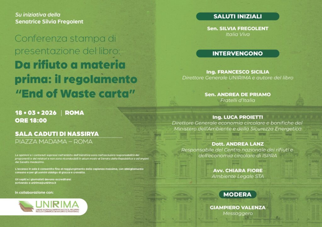 13 Febbraio 2026Mercoledì 18 marzo presso la Sala Caduti di Nassirya del Senato della Repubblica (Piazza Madama 11 – Roma), si terrà la conferenza stampa di presentazione del libro edito da Unirima “Da rifiuto a materia prima: il regolamento ‘End of Waste Carta’”.